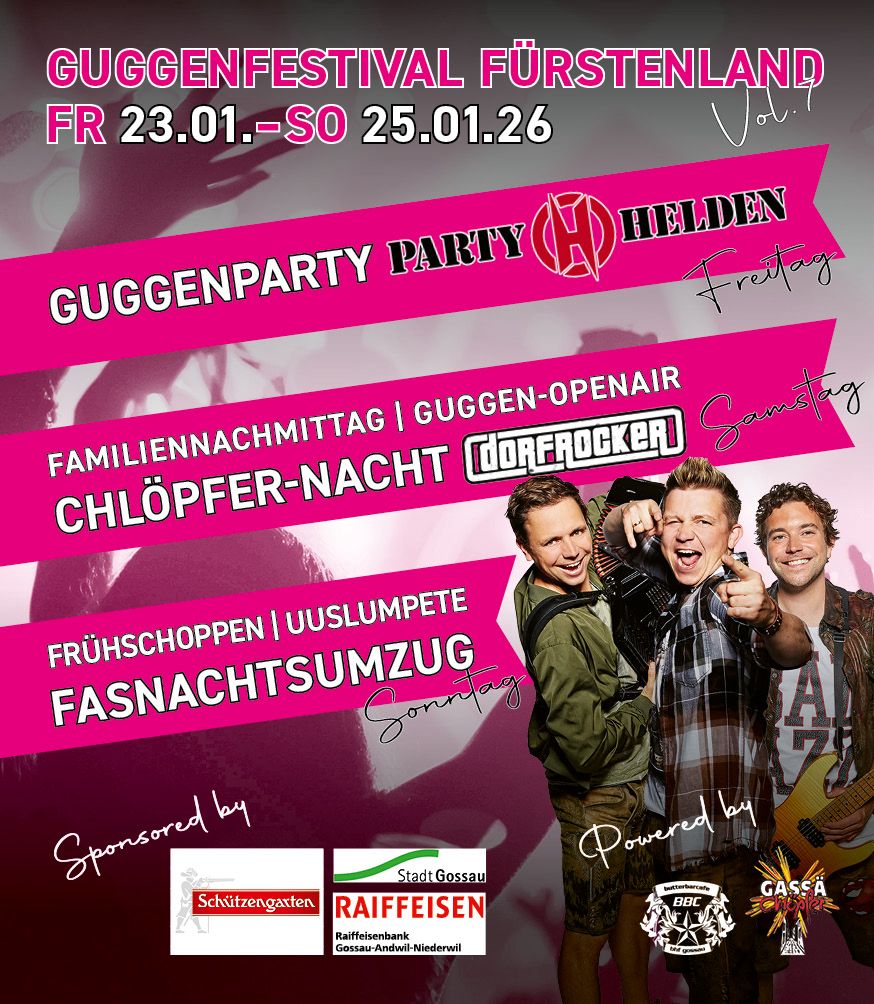 Unter allen Guggenmusiken erwarten euch die PARTYHELDEN, die DORFROCKER und das TRIO GMÜETLICH – Stimmung garantiert!